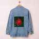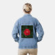 Photo d'une rose rouge dans un jardin. La fleur est entièrement ouverte exposant les tiges jaunes du centre. Une paire de bourgeons rouges pousse derrière la fleur principale. L'arrière - plan est plein de feuilles verts. Copyright ©Kimberly J Tilley.