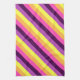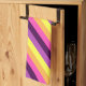 Une serviette de cuisine avec un design motif coloré et mignon de bandes diagonales en prune violet, lavande, jaune citron, orange melon et magenta lumineux.