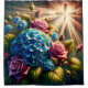 Experience the serene beauty of this spiritual floral arrangement featuring soft pink, shimmering roses adorned with raindrops. The lush green leaves, also glistening with raindrops, add to the freshness and realism of the scene. Blue hydrangeas and delicate rosebuds complement the roses, creating a harmonious and vibrant composition. In the background, a radiant cross with light rays emanates, adding a spiritual and tranquil element to the design. This exquisite artwork captures the essence of a blooming garden after a gentle rain, making it a perfect addition to any decor.