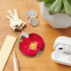 A macro photograph of a bright red single-petal miniature rose with a sunny yellow centre.