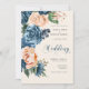 A bright, bold floral of roses in shades of dusty blue and peach is the focal point for many of the pieces of this wedding suite that also features elegant script text and modern design layouts. The wedding invitation shown here has a side border of roses and a beautiful watercolor abstract on the reverse in dusty blue. Easily enter your wedding details using the provided template. Search ID584 to see all the matching pieces in this beautiful wedding set.