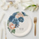 A bright, bold floral of roses in shades of dusty blue and peach is the focal point for many of the pieces of this wedding suite that also features elegant script text and modern design layouts. The wedding paper plate shown here has a side border of roses. Easily enter your wedding date and bride and groom's initials using the provided template. Search ID584 to see all the matching pieces in this beautiful wedding set.