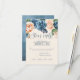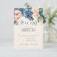 A bright, bold floral of roses in shades of dusty blue and peach is the focal point for many of the pieces of this wedding suite that also features elegant script text and modern design layouts. The wedding RSVP card shown here has an upper border of roses and a beautiful watercolor abstract on the reverse in dusty blue. Easily enter your wedding date and menu requirements using the provided template. Search ID584 to see all the matching pieces in this beautiful wedding set.