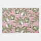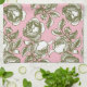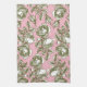 Une serviette de cuisine élégante aux motifs floraux anciens de roses vintages gravés en blanc et faux or sur un arrière - plan rose pâle.