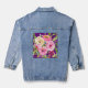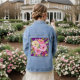 Des roses d'aquarelle luxuriants dans les tons rose, rouge, pêche et crème fleurissent sur un arrière - plan de parties scintillant violet ornent cette veste en denim.