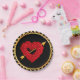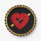 Paper party plates with a heart made of roses with a golden arrow of love shot thru it. The background is black with golden trim around the edges.