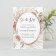 Faire-part de mariage cadre métallisé rose gold avec fleurs de couleur rose blush et feuilles de palmier séchées... Notre luxueux faire-part de mariage bohème floral présente un arrangement de belles roses rose blush, d'eucalyptus et de feuilles de palmier séchées autour d'un faux cadre ovale métallisé rose gold, créant une bordure élégante pour le texte de l'invitation à l'intérieur. Le verso de la carte contient les informations sur votre site web de mariage et un modèle de code QR graphique que vous pouvez remplacer par le vôtre (ou supprimer). Tout le texte d'exemple sur les deux côtés de la carte (sauf le graphique du texte "Save the Date") peut être facilement révisé avec vos propres détails sur le modèle de personnalisation.