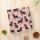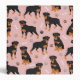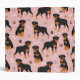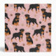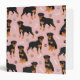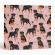 Cute Rottweiler dogs sit and stand with black and tan coats with scattered dog bones and pawprints pattern.