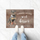 Funny beware of the wet kisser" Rottweiler Dog door mat set on a rustic faux background. Visit our shop to view a large assortment of dog breads
