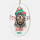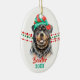 A beautiful Rottweiler dog wears a red and green Santa Claus hat in front of strings of red and green Christmas beads on both sides of this ornament. At the bottom are two text fields in matching red and green for your own text. The back has the same image with a third text field in red. Perfect for anyone who is owned by a Rottie!