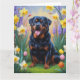 A cheerful dog sits peacefully on lush green grass, surrounded by colourful spring blooms under a soft blue sky. This digital oil painting captures a serene moment with expressive brushstrokes, warm colours, and a sense of gentle joy.