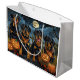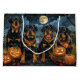 Unleash the spooky spirit with this eerie Halloween design featuring a pack of dogs under a dark, moonlit sky, surrounded by flying bats and glowing pumpkins. Perfect for those who love a touch of frightful fun with their furry friends!