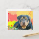 Rottweiler digital portrait of dog laying. Orange and yellow background.