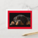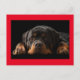 This fun canine postcard features an image of a sleepy brown and black Rottweiler pup resting on a black background. Card is blank and will suit any occasion.