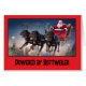 A team of Rottweilers with antlers is leading Santa and his sleigh up in the sky.