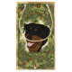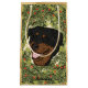 Smiling Rottweiler portrait set against a background of Christmas wreath.