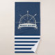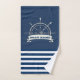 Cette image présente une roue de bateau, une ancre sur un arrière - plan rayé bleu marine.