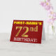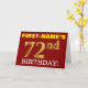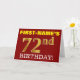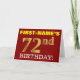Ce design de carte de voeux d’anniversaire comporte un message comme "FIRST-NAME’S 72nd BIRTHDAY!", avec le "72nd" ayant une apparence de couleur fausse/imitation or. Le nom du destinataire sur le devant peut être personnalisé, et l’arrière - plan avant est de couleur rouge. Il comporte également un message d'anniversaire personnalisé à l'intérieur. Une carte de voeux comme celle-ci pourrait peut-être être remise à quelqu'un pour célébrer son soixante-douzième anniversaire. [~Z0000184]