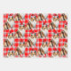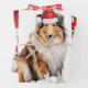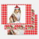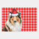 An adorable Rough Collie dog is ready for the holiday season wearing a cute Santa hat and paired with a red holiday plaid on this set of gift wrap for the dog lover.