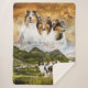 Cuddle up in this comfy and warm Sherpa fleece blanket, vibrantly printed with a beautiful composite artwork depicting a portrait & scene combo of three gorgeous Rough Collies sheepherding in the Scottish Highlands, complemented with the (replaceable) quote “A House is not a Home without a Collie” and optional initials. --- NOTES: This design is made for vertical blankets only, do not change to horizontal orientation. On request, the artwork can be custom-made with your own companions, carefully implemented from your photos. See our “pillows and blankets” product category or the related collection for matching pillows and other blanket types.--- CONTACT: For help and custom adaptation requests, contact us on Zazzle, FB, or via email, or visit our related product page at https://petsdreamlands.com/pid-bls-slst001brca-v. Enjoy!