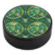 Round coaster featuring a vibrant floral pattern with green leaves and circular motifs. The side view shows a textured black edge, adding contrast.