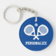 Round custom keychain gift for padel player. Add your own text like a name, funny slogan, quote, joke, saying. Cute Birthday party favour for men women and kids. (boy or girl), Custom key chains with crossed rackets and ball logo design. Blue or custom background colour.