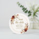 Announce your special day with this elegant round fall wedding Save the Date card. Featuring watercolor burgundy roses, burnt orange dahlias, eucalyptus greenery, golden autumn leaves, and soft cream accents, this design perfectly captures the cozy beauty of autumn.