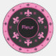 Round stickers in your choice of two sizes, with a fancy fleur de lis design. This one is primarily pink and black, and we added a black background, which you can change if you like. Also change the text in the centre, add your initials, a monogram, a business name, a team name, or just remove the text and leave it blank. The fleur-de-lis is a stylized lily (in French, fleur means flower, and lis means lily) or iris used as a decorative design or symbol. It's a symbol of all things France, and Quebec, and New Orleans and many other places.