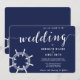 Custom round nautical navy blue wedding invites with white wheel and customizable text