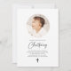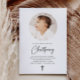A modern, minimal Christening Invitation featuring a round photo and the word 'Christening' in a calligraphy style font. Please note that you cannot change the 'Christening' word but you can edit all of the other text in this design. You can change the colour or you can delete it and replace it with a new text box if you prefer.