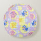 Violet round pillow with cute toy animals floating on gingham bubbles.