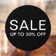 Sale sign window cling featuring two rows of customizable text on a black circle background. Default text is "Sale" and "up to 50% off". Put on your shop window to announce current sales.