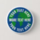 Round save planet earth custom pinback buttons. Blue and green world map globe logo with white text template. Create stickers for global warming, climate change environmental issues, nature preserve, green energy, forest protection, protests, plastic soup, recycle, recycling etc. Land sea drawing. Save the planet, save the earth!