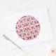 Round sticker design featuring vibrant pink flowers and green leaves on a white background. The sheet displays five identical stickers, conveying a floral, cheerful tone.