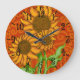 This design of Sunflower Trio is a cheery summer trio of sunflowers on a red background with flourishes and stripes.