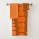 This towel set has a mid-century modern design of rounded rectangles in two shades of orange running vertically on a field of brown.