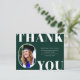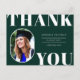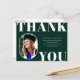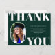 Rounded front photo frame, senior class graduation thank you postcard. Solid green colour background, white bold type "THANK YOU" and text template lines for graduate's name, class of year and school.