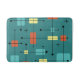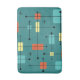 This atomic-age inspired mid century modern design has bold lines and geometric shapes in teal, turquoise, yellow and orange.