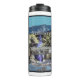 A digital landscape painting of scenic Vermont. Stowe Mountain rises above Moss Glen Falls, with a light blue sky as a background. As the cold water rushes down to go beneath a covered bridge, it ends up in Warren Falls. There is a black border around the artwork. In a white font there is, "Vermont", "Beautiful Route 100". And you can find the statehood year at the bridge footings, looking like a carved 1791. A turkey stands watchful at the bridge's entrance. Image Copyright ©2023 Kimberly J Tilley.