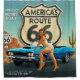 A bold, vintage-inspired Route 66 design featuring the iconic highway shield, a blue classic convertible, and a glamorous pin‑up pose set against a Southwest desert backdrop—perfect for road‑trip lovers, Americana fans, and retro garage décor