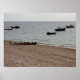 Several fishing boats are scattered across the calm sea near a pebble beach under an overcast sky. A wooden groyne protrudes into the water, marking the boundary of the beach area. Anchored off shore the various boats are arranged in rows by the current and waves. Not actual rowing boats but rows of boats made symmetrical by nature.