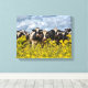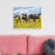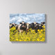 This wrapped canvas features a row of black and white cows standing behind a barbed wire fence with bright yellow weeds in the foreground and a turbulent blue-grey sky behind. It would be a perfect pop of colour wherever you display it.