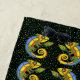 This custom beach towel has row of bright colourful smiling lizards in yellow, orange, green, and blue holding on to branches with a leaf on a black background covered in tiny green polka dots.
