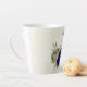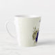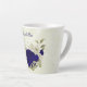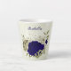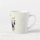 Beautiful romantic latte mug featuring royal blue and beige flowers and some leaves .
