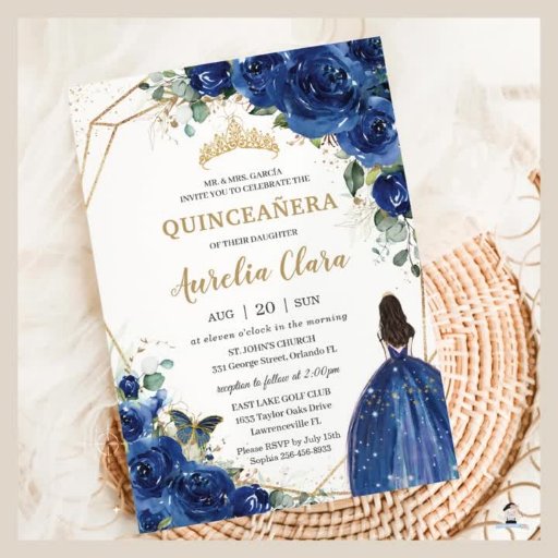 Chic Royal Blue Floral Quinceañera Birthday GoldDesigned by The Happy Cat Studio