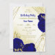 Beautiful birthday party invitation featuring Royal blue flowers and gold leaves.