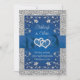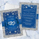 If you've found the love of your life and want to invite all your family and friends to witness the joining of your two lives and hearts then this royal blue and grey floral wedding invitation with images of a pair of joined hearts overtop a blue ribbon and bow ribbon image running across the centre of the invitation is sure to get everyone's attention. The front side has the names of the bride and groom above the hearts, and below the hearts is a customizable verse that says, "Two lives, two hearts, joined together by friendship, united forever in love". The backside has the same hearts from the front at the top of the backside on a royal blue background with your wedding ceremony and reception details printed on in light grey. There is a simulated silver border around the entire card on the front and back. If you need any additional matching items, please email your request to niteowlstudio@gmail.com or use the Zazzle chat feature to get in touch.