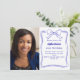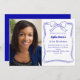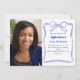 A white background, decorated with a royal blue hand-drawn bow and frame. Personalize and add a photo, name and party details.