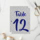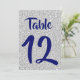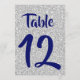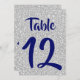 An elegant monogram wedding table card with royal blue numbers on a silver glitter background effect. The font's style, colour and placement can also be changed any way you like.