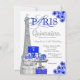 Paris Sweet Quinceanera 15th birthday party invitation with beautiful silver Eiffel Tower, elegant Paris gift packages, silver glitter high heel shoes and fancy royal blue Paris script on a rich blue floral background. This beautiful Paris Quinceanera invitation is easily customized for your event by simply adding your details in the font style and colour, and wording of your choice. This is a printed design with no real diamonds, jewels, glitter, etc.